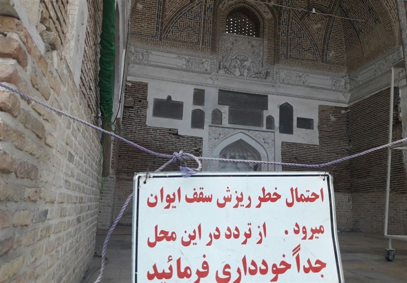 فرقی نمی‌کند از ضلع شمالی یا جنوبی وارد مسجد شویم، ایوان غربی با آن تابلوی زرد کوچک و طناب‌هایی که مقابل آن کشیده شده خیلی زود به چشم می‌آید. تابلویی که در آن خطر ریزش تاق ایوان را هشدار می‌دهد و از افراد خواسته شده تا به این قسمت که بخشی از تاریخ کهن مردمان این سرزمین است، نزدیک نشوند. با این‌حال در برخی ماه‌های سال از جمله محرم و صفر و ماه رمضان که جمعیت بیشتری به این مسجد می‌آیند، برای برقراری اتصال نماز، برخی از مردم باید در همین ایوان اقامه نماز کنند.
