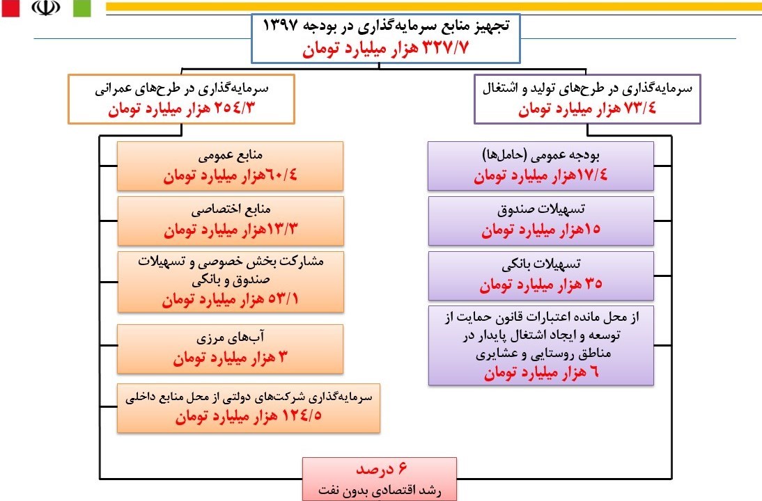 بر این اساس سرمایه گذاری 73 هزار میلیارد تومانی شامل 17 هزار میلیارد تومان بودجه عمومی(حاملهای انرژی)، 18 هزار میلیارد تومان تسهیلات صندوق توسعه ملی، 35 هزار میلیارد تومان تسهیلات بانکی و 6 هزار میلیارد تومان از محل مانده اعتبارات قانون حمایت از اشتغال پایدار در مناطق روستایی میباشد.