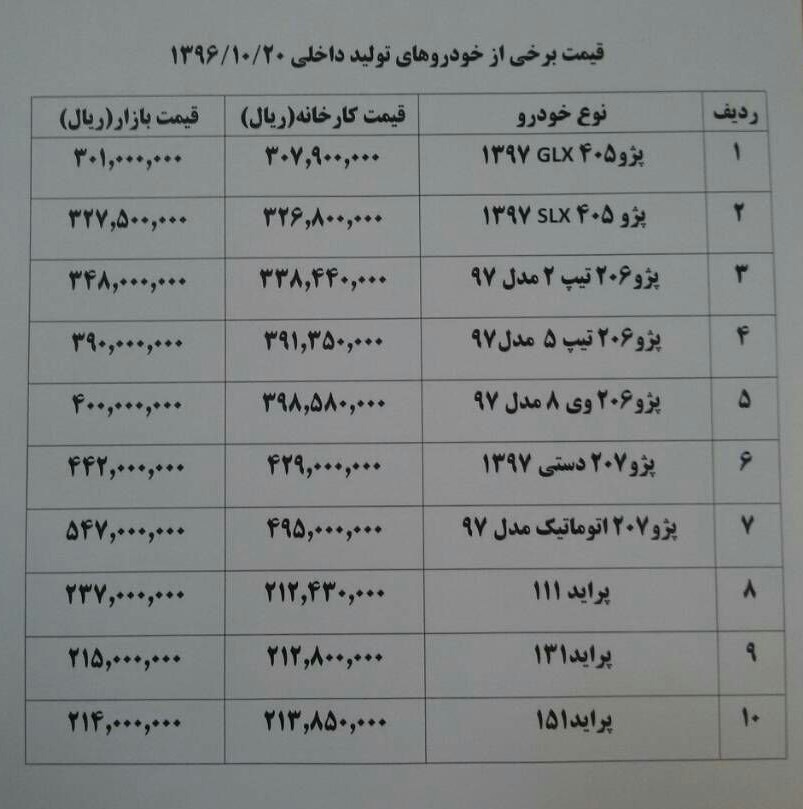قیمت تعدادی از خودروهای داخلی به شرح زیر است: