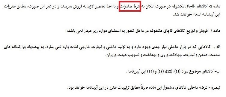گفتنی است ماده 2 آیین نامه مواد 54 و 55 قانون مبارزه با قاچاق کالا به موضوع فروش کالای قاچاق به شرط صادرات و در غیر این صورت امحا آن تصریح دارد.