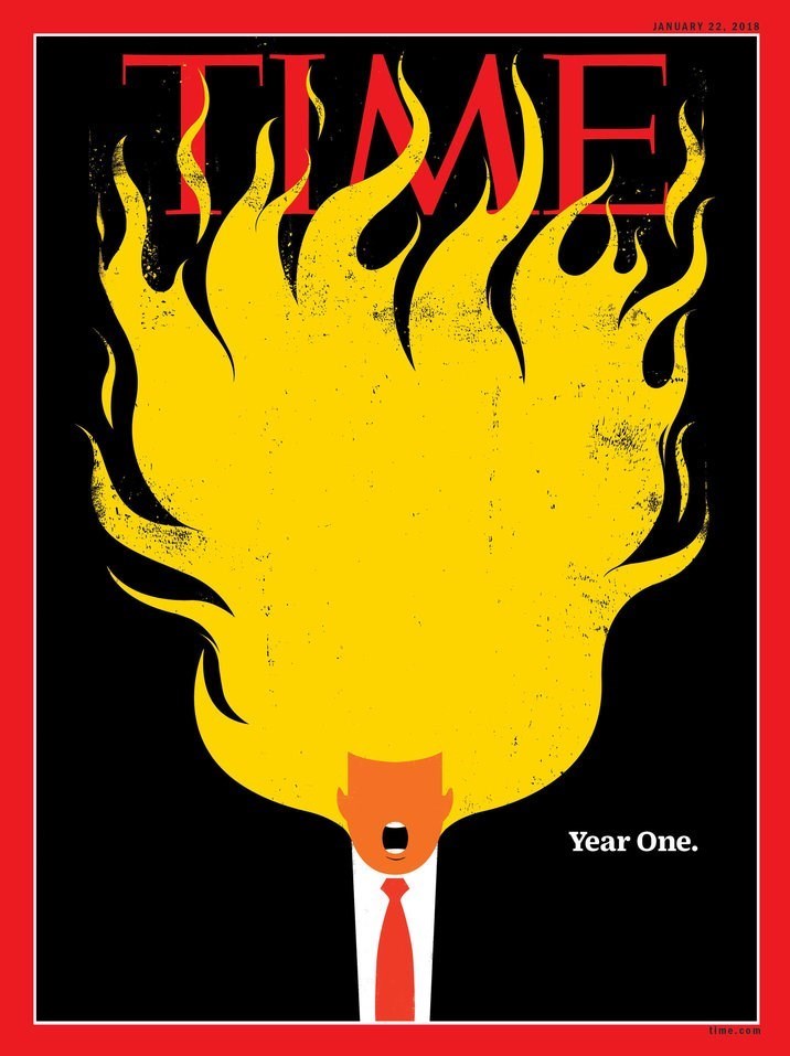 به گزارش گروه بینالملل خبرگزاری تسنیم، نشریه تایم در طرح روی جلد شماره جدید خود با تصویرپردازی چهره ترامپ، موهای وی را شعلهور نشان داده است، امری که به گفته ایدل رودریگوئز، طراح این تصویرپردازی، به کتاب تازه منتشر شده درباره عملکرد ترامپ در کاخ سفید تحت عنوان «آتش و خشم» ارجاع دارد. عنوانی که به نوبه خود از تهدیدهای متعدد ترامپ علیه کشورهای مختلف و بهطور خاص کرهشمالی نشأت میگیرد.