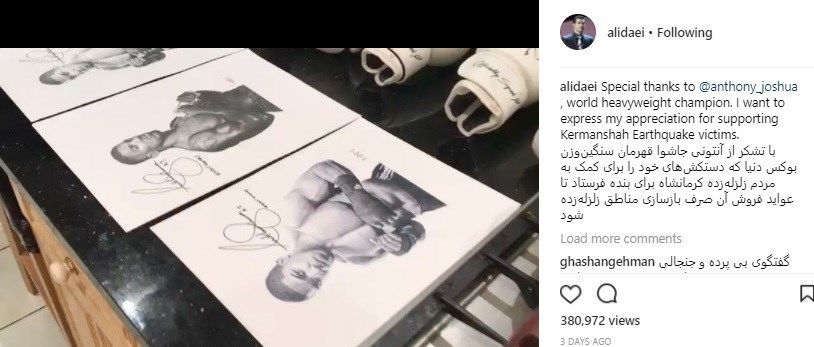 در جدیدترین این اقدامات انسان دوستانه، آنتونی جاشوا قهرمان سنگینوزن بوکس دنیا، دستکشهایش را امضا و برای کمک به مردم زلزلهزده کرمانشاه به علی دایی فرستاد، تا عواید فروشش صرف بازسازی مناطق زلزلهزده شود.