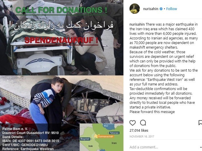 نوری شاهین بازیکن ترکیهای دورتموند آلمان و امره جان بازیکن آلمانی لیورپول نیز در پیام هایی جداگانه با اعلام شماره حسابی از هوادارانشان خواستند تا به زلزلهزدگان کرمانشاه ایران کمک کنند.