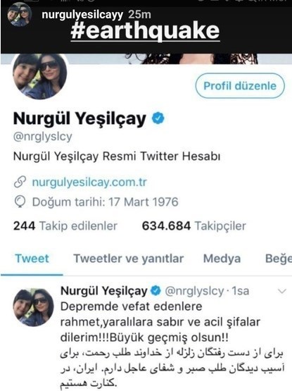 یشیل چای بازیگر زن ترکیه ای که به تازگی با فرهاد اصلانی همبازی شده بود هم یکی دیگر از بازیگرانی بود که در استوری اینستاگرامش به حادثهدیدگان زلزله در ایران تسلیت گفت و نوشت: ایران در کنارت هستیم.
