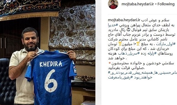 لباس رئال مادرید، سامی خدیرا بازیکن آلمانی حال حاضر یوونتوس ایتالیا هم به لطف یکی از خیرین به مبلغ 10میلیون تومان خریداری شد تا این مبلغ صرف زلزله زدگان شود.