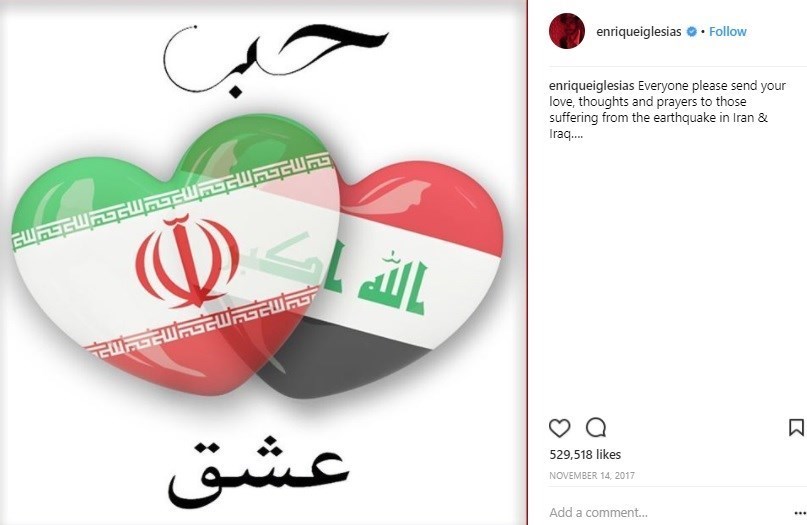 یکی از دیگر از سلبریتیهایی که به زلزلهی کرمانشاه واکنش نشان داد، انریکه ایگلسیاس،خوانندهی مشهور اسپانیایی بود. انریکه با انتشار پرچم ایران و عراق در اینستاگرامش با مردم این دو کشور ابراز همدردی کرد.