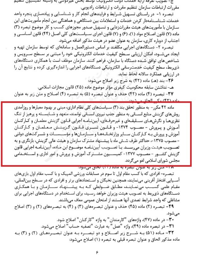 به گزارش خبرنگار اقتصادی خبرگزاری تسنیم، بر اساس ماده 42 لایحه دائمی شدن قانون مدیریت خدمات کشوری به منظور تحقق بند 3 سیاستهای کلی نظام اداری مبنی بر بهبود معیارها و روزآمدی روشهای گزینش منابع انسانی به منظور جذب  نیروی انسانی توانمند، متعهد وشایسته و پرهیز از تنگ نظری‌ها و نگرش سلیقه‌ای و غیر حرفه ای آیین نامه اجرایی قانون گزینش معلمان و کارکنان آموزش و پرورش مصوب سال 1374 و قانون تسری قانون گزینش معلمان و کارکنان آموزش و پرورش به کارکنان سایر وزارت خانه‌ها و سازمانها مصوب سال 1375؛ حداکثر ظرف مدت شش ماه با پیشنهاد مشترک سازمان اداری و استخدامی و هیئت گزینش بازنگری و به تصویب هیئت وزیران خواهد رسید.