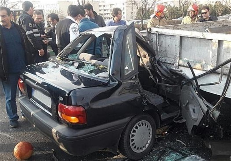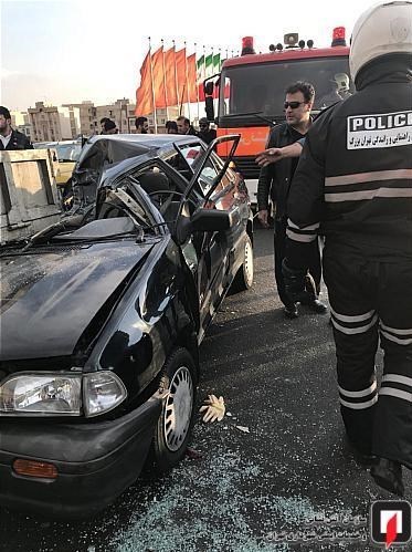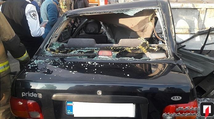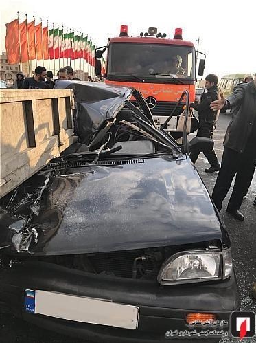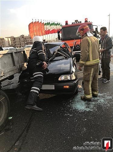 پرایدی که دو سرنشین داشت بعد از تصادف با کامیونت در بزرگراه شهید ستاری، متلاشی شد.