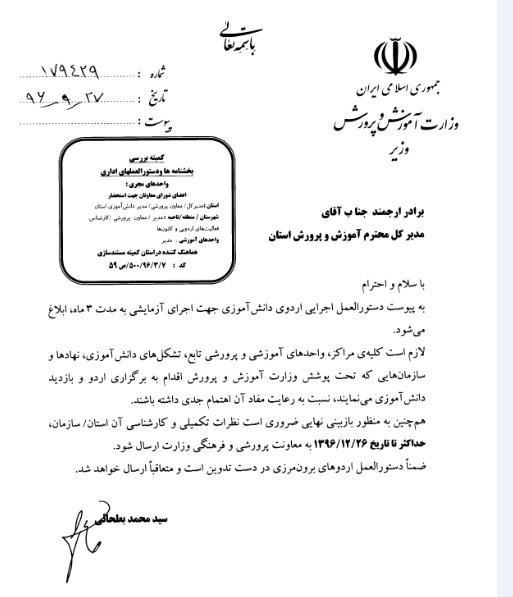 دستورالعمل جدید اردوهای دانشآموز در تاریخ 27 آذر امسال با امضای سیدمحمد بطحایی جهت اجرای آزمایشی به مدت 3 ماه ابلاغ شد و هر چند که این دستورالعمل نکات مهمی را در بحث ایمنسازی اردوهای دانشآموزان مورد توجه قرار داده اما یک تبصره آن بسیار عجیب است.