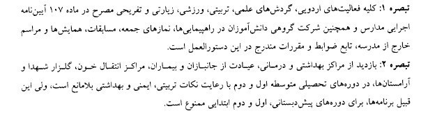 بر اساس یکی از تبصرههای دستورالعمل جدید اردوهای دانشآموزان "بازدید از مراکز بهداشتی و درمانی، عیادت از جانبازان و بیماران، مراکز انتقال خون، گلزار شهدا و آرامستانها در دورههای تحصیلی متوسطه اول و دوم با رعایت نکات تربیتی، ایمنی و بهداشتی بلامانع است ولی این برنامهها برای دورههای پیش دبستانی، اول و دوم ابتدایی ممنوع است."