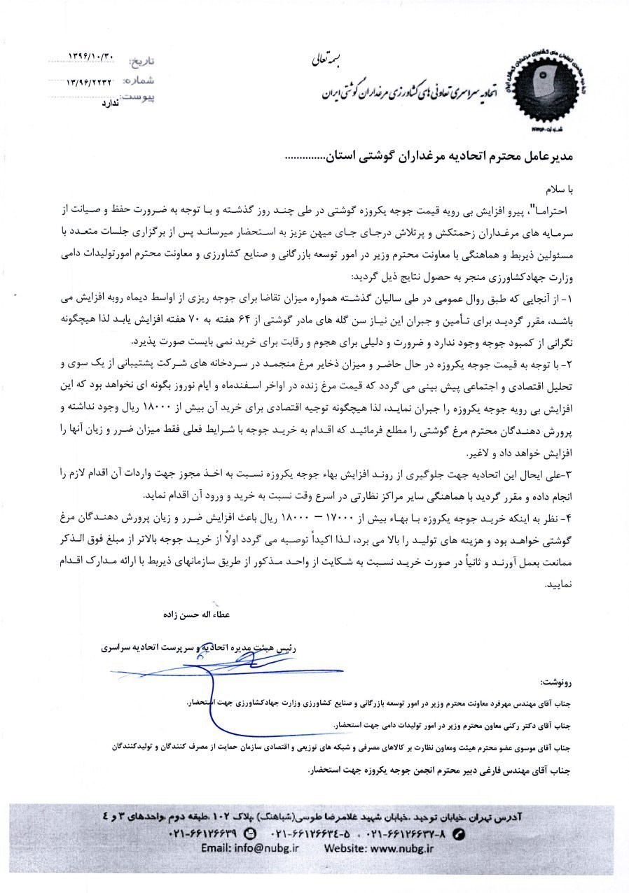 به گزارش خبرنگار بازرگانی خبرگزاری تسنیم، عطاءالله حسنزاده رئیس هیئت مدیره اتحادیه سراسری مرغدارن گوشتی با ارسال نامه ای به مدیران عامل اتحادیه مرغداران گوشتی استان ها نوشت: «احتراما پیرو افزایش بیرویه قیمت جوجه یک روزه گوشتی در طی چند روز گذشته و با توجه به ضرورت حفظ و صیانت از سرمایههای مرغداران زحمتکش و پرتلاش در جای جای میهن عزیز به استحضار میررساند پس از برگزاری جلسات متعدد با مسئوین ذیربط و هماهنگی با معاونت وزیر در امور توسعه بازرگانی و صنایع کشاورزی و معاونت امور تولیدات دامی وزارت جهاد کشاورزی منجر به حصول نتایج ذیل گردید: