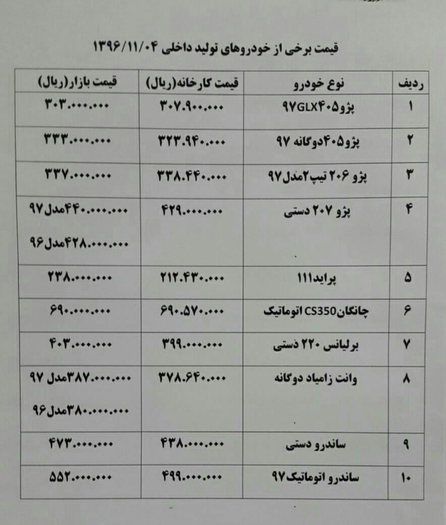 قیمت تعدادی از خودروهای داخلی در بازار امروز به شرح زیر است: