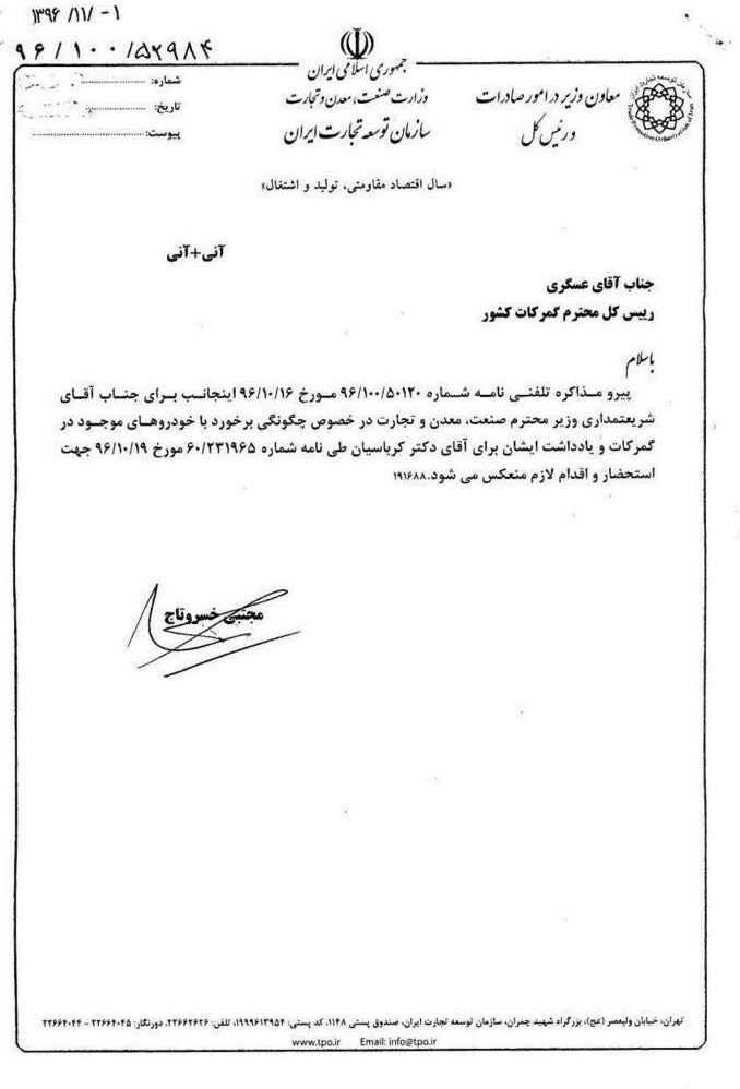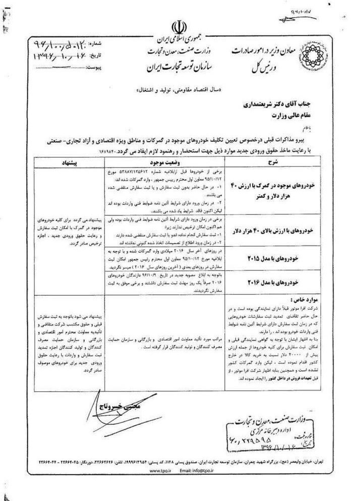 نکته جالب توجه آنکه رئیس سازمان توسعه تجارت پیشنهاد ترخیص خودروهای با ارزش بالای 40 هزار دلار را نیز به وزیر صنعت مطرح کرده و وزیر نیز این پیشنهاد را پذیرفته است. موضوع از آن قرار است که بهتازگی دولت مصوبهای داشته که بر اساس آن واردات خودرو با ارزش بالای 40 هزار دلار ممنوع شده است.
