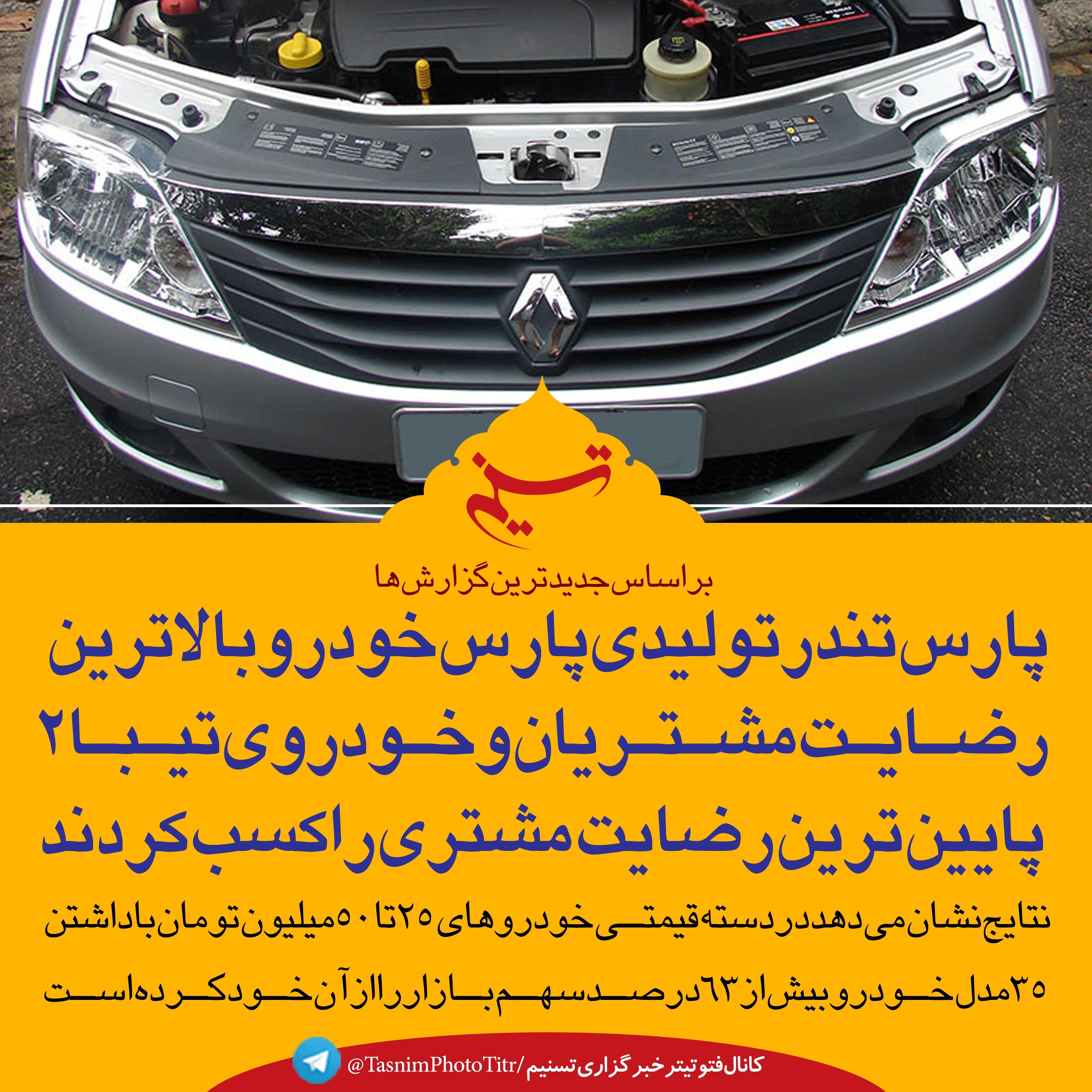 براساس جدیدترین گزارش‌ها در دسته قیمتی خودروهای 25 تا 50 میلیون تومان پارس تندر تولیدی پارس خودرو بالاترین عدد رضایت مشتریان و خودروی تیبا2 پایین­ترین رضایت را در میان خودروهای این رده کسب نموده­ است.