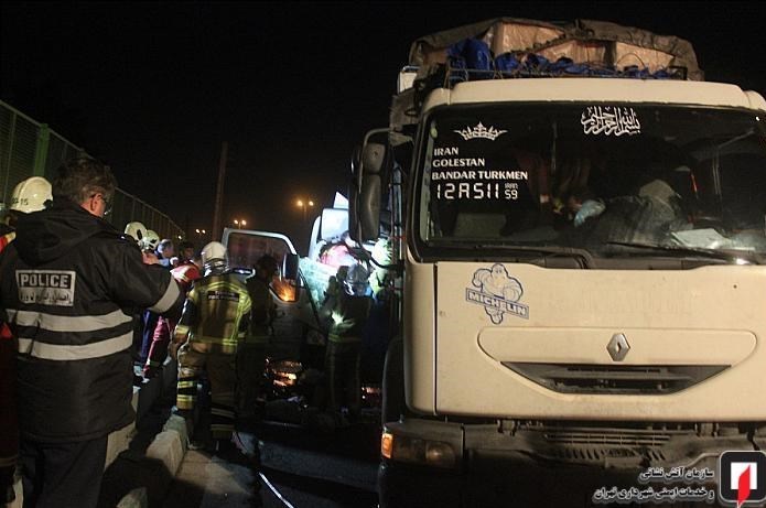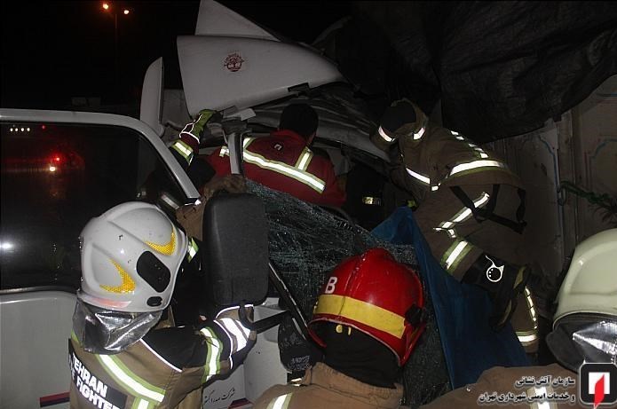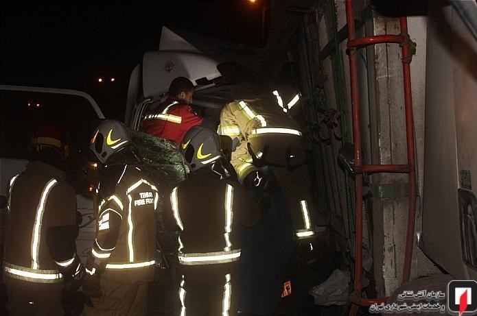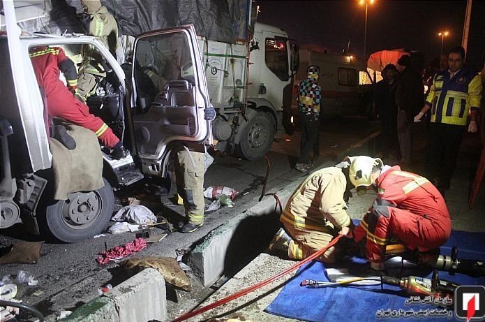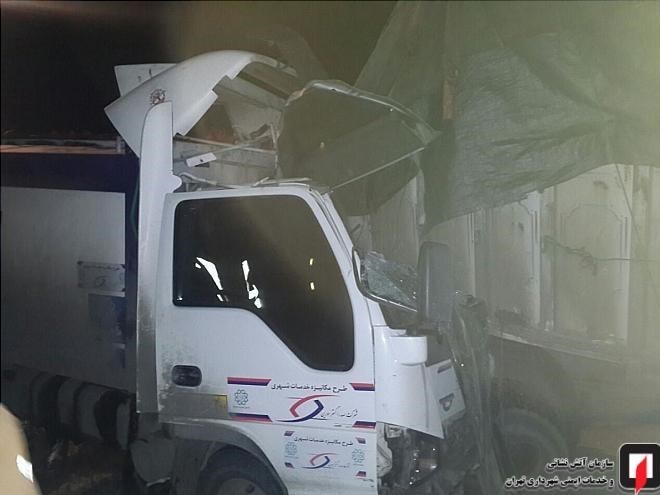 سعید فراهانی؛ افسر آماده منطقه 6 عملیات آتشنشانی تهران درباره جزئیات این حادثه اظهار کرد: یک دستگاه کامیون ایسوزو حین حرکت در بزرگراه یاسینی به علت نامعلومی به شدت با قسمت عقب یک دستگاه کامیون ایویکو در حال حرکت، برخورد کرد.