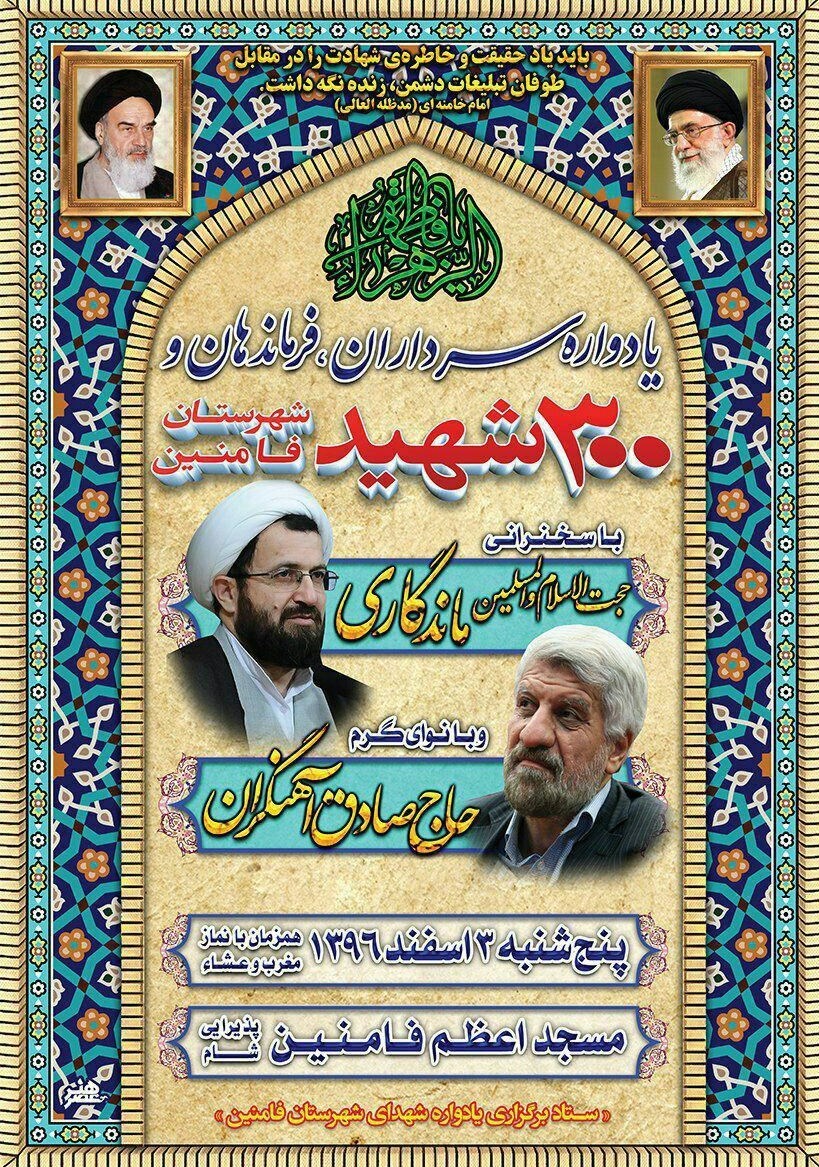 به گزارش خبرگزاری تسنیم از همدان، این یادواره با حضور خانواده معظم شهدا، رزمندگان دوران دفاع مقدس و مردم متدین فامنین، فردا پنج شنبه 3 اسفند پس از برگزاری نماز مغرب و عشاء در مسجد اعظم این شهرستان برگزار میشود.