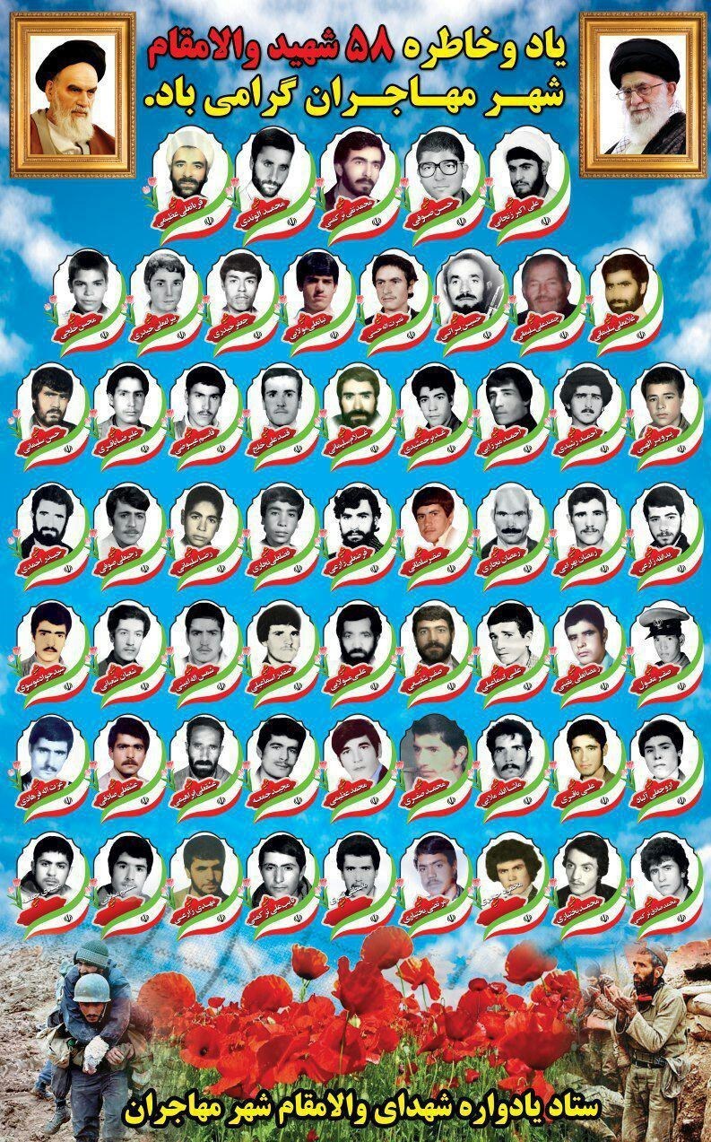 ابراهیمی اعلام کرد: "رمضان نجاری"، "صفر سلطانی"، "فرضعلی زارعی"، "فضلعلی نجاری"، "رضا سلیمانی"، "رجبعلی صوفی"، "حیدر احمدی"، "صفر مغول"، "رمضان یقینی"، "علی اسماعیلی"، صفر شفیعی"، "علی مولایی"، "صفدر اسماعیلی"، "شمس الله امینی"، "شعبان شعبانی"، اروجعلی آلباد"، "علی باقری"، "ماشاءالله ملایی"، "محمد صفری"، "محمد عظیمی"، "مجید جمعه"، عشقعلی ابراهیمی"، "عشقعلی صادقی"، "عزت‌الله فرهادی"، محمدصادق ترکمنی"، "محمد بختیاری"، "محمود حیدری"، "مرتضی بختیاری"، "مصطفی قنبری"، "نایب‌علی زارعی"، "مهدی زارعی"، "مسلم ملایی" و "مهدی جمعه" از دیگر شهدای شهر مهاجران هستند.