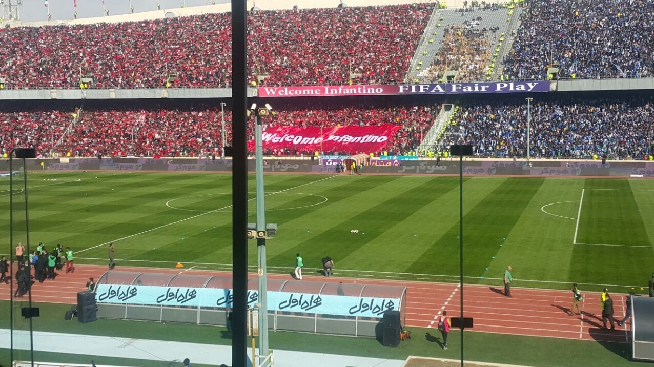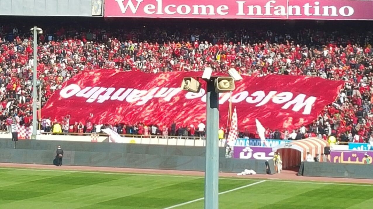 * هواداران پرسپولیس با هماهنگی لیدرهای باشگاه، بنر بزرگی را برای خوشامدگویی به اینفانتینو تدارک دیده بودند که وقتی آن را برای امتحان در سکوها باز کردند، برعکس به دست گرفتند تا حسابی سوژه استقلالیها شوند.