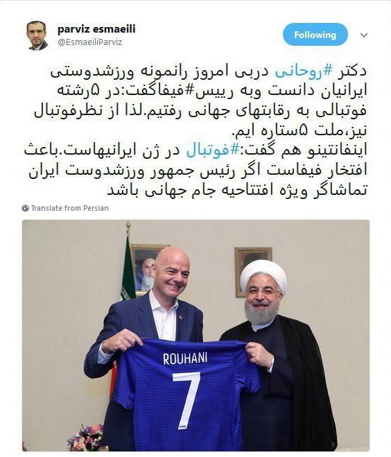 بر همین اساس پرویز اسماعیلی معاون ارتباطات و اطلاع رسانی دفتر رئیسجمهور از دعوت حجتالاسلام روحانی به مسکو جهت شرکت در مراسم افتتاحیه جام جهانی خبر داد و به نقل از رئیس فیفا نوشت: باعث افتخار فیفاست که اگر رئیسجمهور ورزش دوست ایران تماشگر ویژه افتتاحیه جام جهانی باشد.