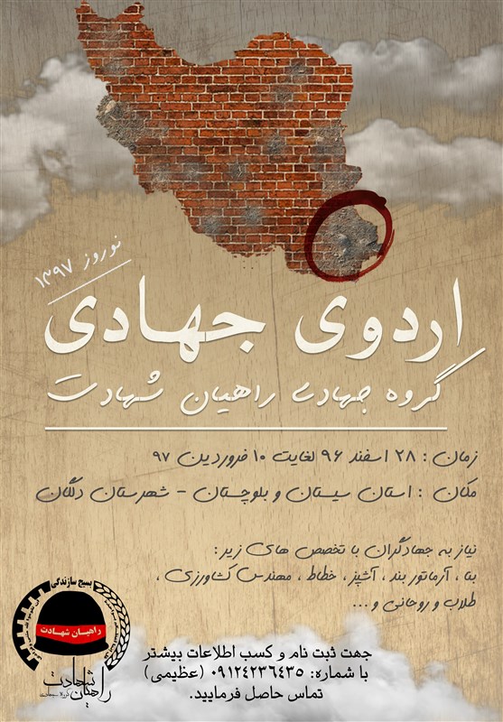 عظیمی گفت: زمان این اردو از 28 اسفند 96 لغایت 10 فروردین 97 در شهرستان دلگان استان سیستان و بلوچستان بوده و علاقه مندان جهت ثبت نام با شماره 09124236435 تماس حاصل کنند.
