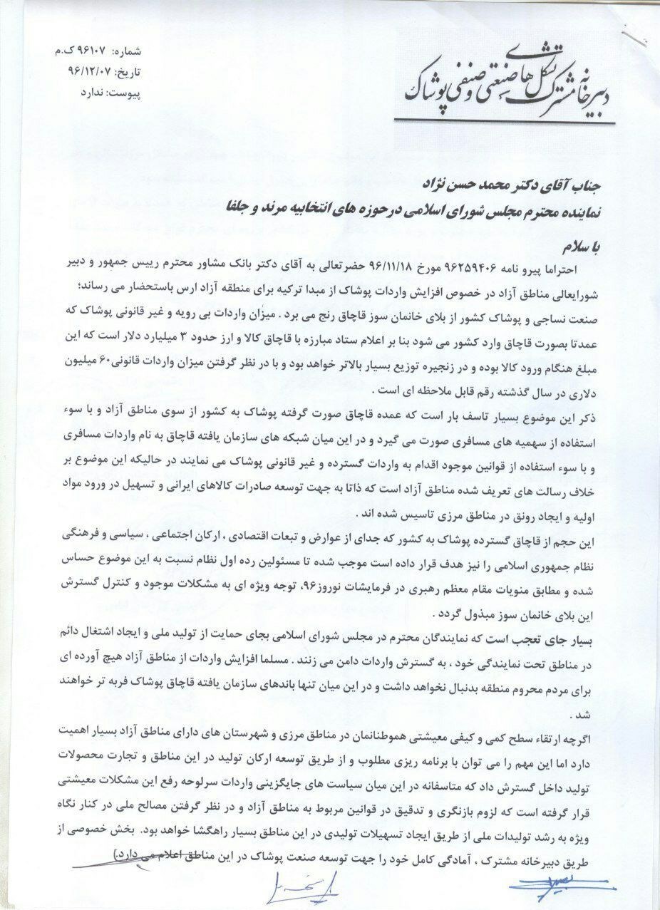 به گزارش خبرنگار اقتصادی خبرگزاری تسنیم، جمعی از تشکلهای صنعتی و صنفی پوشاک کشور با ارسال نامه‌ای خواستار عدم افزایش سهمیه واردات پوشاک شدند. در این نامه که خطاب به محمد حسن نژاد نماینده مردم مرند و جلفا در مجلس است، آمده که پیرو درخواست شما و آقای بانک مشاور رئیس جمهور و دبیر شورای عالی مناطق آزاد در خصوص افزایش واردات پوشاک از مبدأ ترکیه برای منطقه آزاد ارس به استحضار می‌رساند: صنعت نساجی و پوشاک کشور از بلای خانمان سوز قاچاق رنج می‌برد. میزان واردات بی‌رویه و غیرقانونی پوشاک که عمدتا به صورت قاچاق وارد کشور می‌شود بنا براعلام ستاد مبارزه با قاچاق کالا و ارز، حدود سه میلیارد دلار است که این مبلغ هنگام ورود کالا بوده و در زنجیره توزیع بسیار بالاتر خواهد رفت.