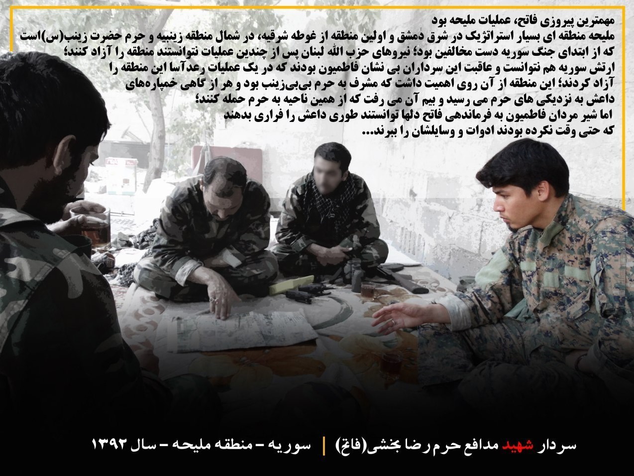 به گزارش خبرنگار فرهنگی باشگاه خبرنگاران پویا، مهمترین پیروزی فاتح، عملیات ملیحه بود. ملیحه، منطقهای بسیار استراتژیک در شرق دمشق و اولین منطقه از غوطه شرقیه، در شمال منطقه زینبیه و حرم حضرت زینب(س) است، که از ابتدای جنگ سوریه دست مخالفین بود. نیروهای حزبالله لبنان پس از چندین عملیات نتوانستند منطقه را آزاد کنند. ارتش سوریه هم نتوانست و عاقبت این سرداران بینشان فاطمیون بودند که در یک عملیات رعدآسا این منطقه را آزاد کردند.