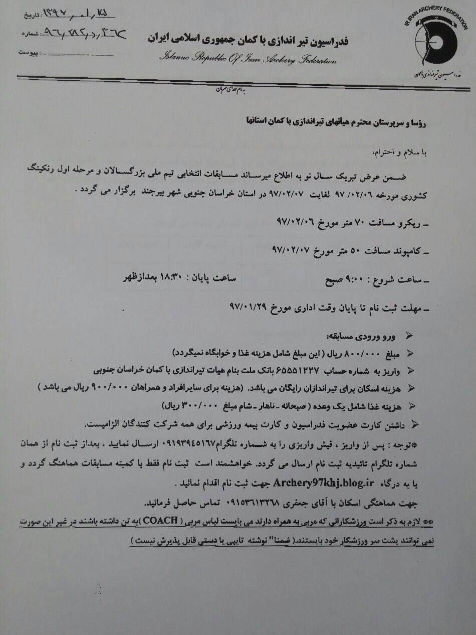به گزارش خبرگزاری تسنیم، مسابقات انتخابی تیم ملی بزرگسالان و مرحله اول رنکینگ کشوری در رشتههای ریکرو و کامپوند و در دو بخش آقایان و بانوان، مورخه 6 لغایت 7 اردیبهشت ماه سال 1397 در استان خراسان جنوبی شهر بیرجند برگزار میشود.