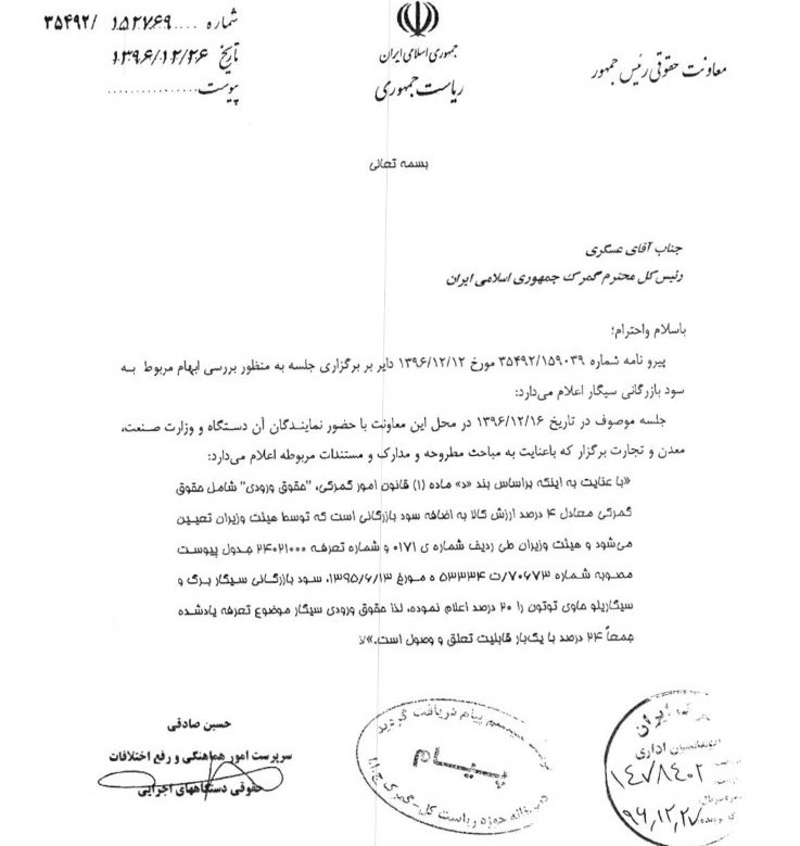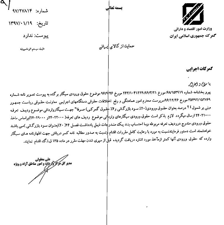 به گزارش خبرنگار اقتصادی خبرگزاری تسنیم، بر اساس بخشنامه دفتر واردات گمرک و با توجه به مکاتبه معاونت حقوقی رییس جمهور، حقوق ورودی سیگار و سیگار برگ، 24 درصد اعلام شد. بر این اساس سود بازرگانی سیگار 20 و حقوق ورودی آن 4 درصد میباشد به این ترتیب مجموع حقوق ورودی سیگار برگ 24 درصد خواهد بود.