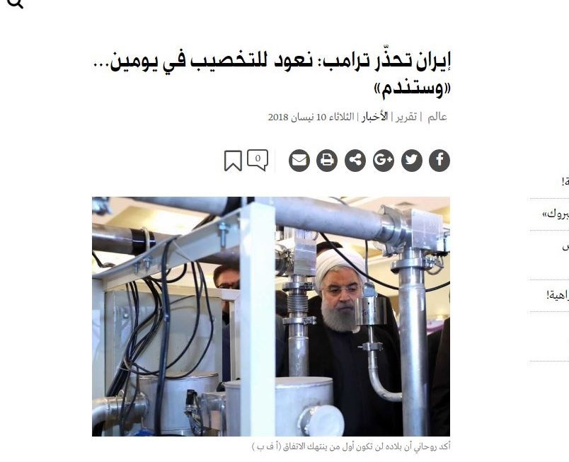 اما در مورد اظهارات روز گذشته رئیس جمهوری اسلامی ایران، پایگاه خبری شبکه تلویزیونی الجزیره قطر نوشت: رئیس جمهور ایران روز گذشته به آمریکا هشدار داد در صورت خروج از توافق هستهای پشیمان خواهد شد.