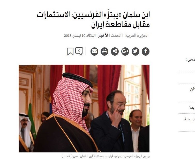 الاخبار در مطلب دیگری با اشاره به سفر محمد بن سلمان ولیعهد سعودی به فرانسه نوشت: باجخواهی بنسلمان از فرانسویها: سرمایهگذاری مقابل تحریم ایران.