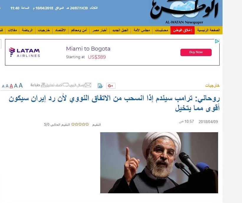 روزنامه الوطن کویت نیز در تیتری مشابه، به اظهارات صالحی و روحانی درباره توانمندیهای هستهای ایران و نیز عاقبت خروج احتمالی آمریکا از توافق هستهای اشاره کرد.