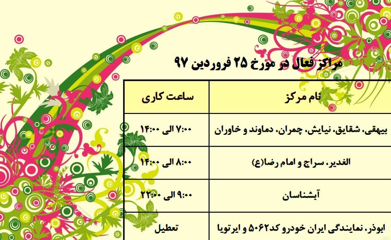 به گزارش خبرگزاری تسنیم،روابط عمومی مراکز معاینه فنی خودروهای شهر تهران مراکز فعال این مجموعه را که روز شنبه 25 فروردین(مبعث حضرت رسول اکرم(ص)) فعال هستند را اعلام کرد.