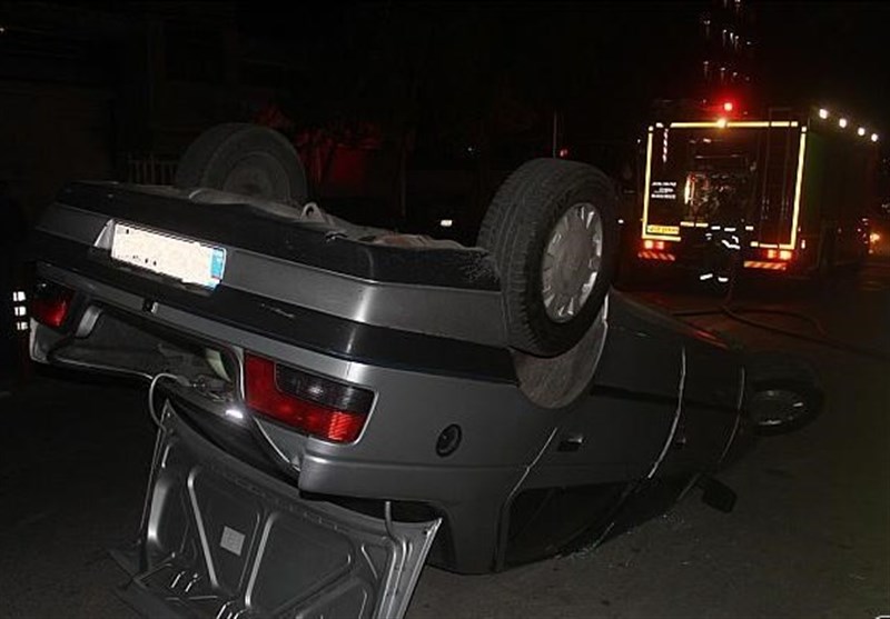 خودروی پژو پارس پس از برخورد با جدول وسط خیابان واژگون شد.