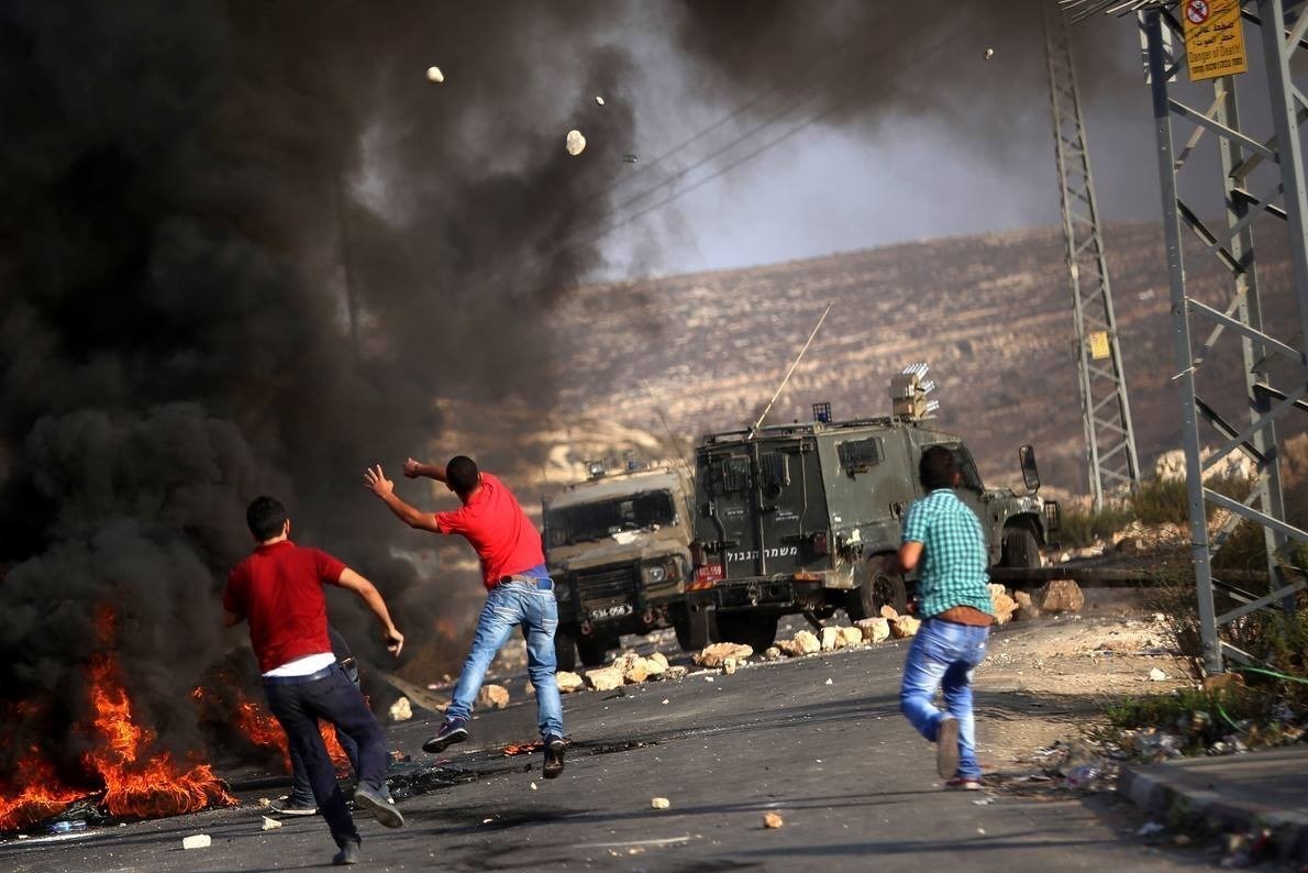 جوانان فلسطینی برای کور کردن نقطه دید تکتیراندازان صهیونیست، تعداد زیادی لاستیک مستعمل را آتش زدهاند.