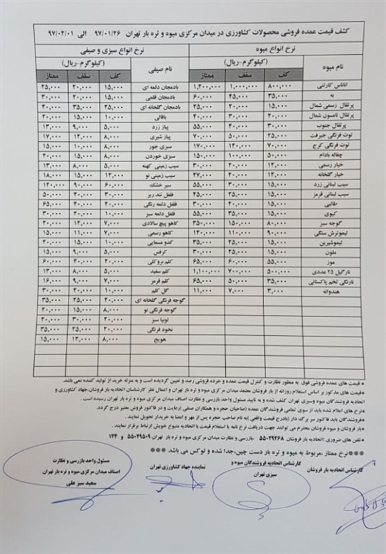 قیمتهای مذکور بر اساس استعلام روزانه از بارفروشان متعدد میدان مرکزی میوه و ترهبار تهران و اعمال نظر کارشناسان اتحادیه بارفروشان جهاد کشاورزی و اتحادیه فروشندگان میوه و سبزی تهران کشف شده و به تایید واحدهای بازرسی و نظارت اصناف میدان مرکزی میوه و ترهبار تهران رسیده است.