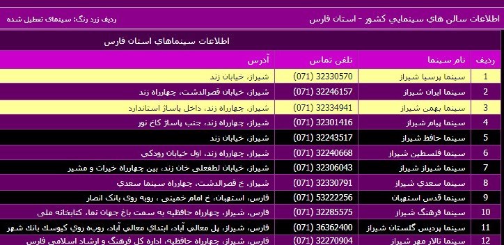 براساس آمار سامانه جامع اطلاعات سالنهای سینمای ایران 12 سالن سینما در استان فارس موجود است که تنها یکی از این سالنها در شهرستان استهبان و مابقی در شیراز است و طبق اطلاعات بالا سینما پرسیا و بهمن شیراز تعطیل شده است. البته آپدیت این آمار مربوط به 25 اردیبهشت ماه سال 96 بوده است و بعد از این تاریخ نیز سینما هنرشهر آفتاب نیز در شیراز افتتاح شده است.