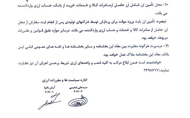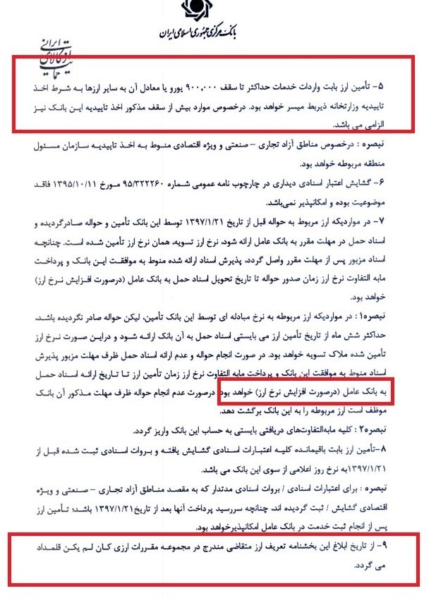 بر اساس بند 5 این بخشنامه،  سقف تامین ارز برای واردات خدمات حداکثر تا 900 هزار یورو به شرط اخذ تاییده‌های لازم از وزارت خانه‌های زیربط خواهد بود و از این پس تعریف ارز متقاضی در مجموعه مقررات ارزی کان لم یکن قلمداد میگردد.