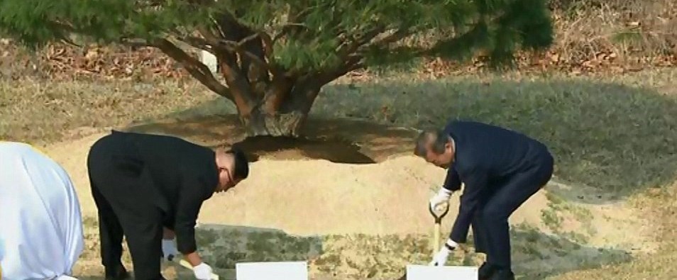 پس از صرف ناهار جداگانه رهبر کره شمالی باز هم به کره جنوبی بازگشت و به همراه رئیس جمهور کره جنوبی درخت یادگاری مشترک کاشتند البته با خاکهایی از کوههای دو کشور.
