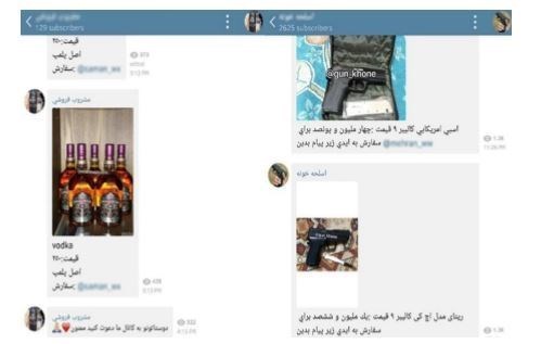 سالمترین کسب و کار غیرمجاز در تلگرام، فروش اجناس قاچاق است که ضرر اقتصادی فراوانی را برای تولیدکننده داخلی و حتی فروشندگان رسمی کشور ما به همراه دارند. اما از آنجا که مدیران کانالهای تلگرام امکان شناسایی ندارند، خرید و فروش به این موارد محدود نشده و هرگونه اقلام ممنوعه و نیز خدمات و محصولات غیرمجاز، به سادگی در تلگرام انجام میشوند و اغلب این افراد راه ارتباط خود را صرفا یک آیدی تلگرام اعلام میکنند. تصاویر زیر برخی کانالهای تلگرامی مربوط به توزیع و فروش مشروبات الکلی و اسلحه را نشان می دهد: