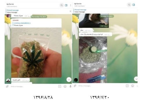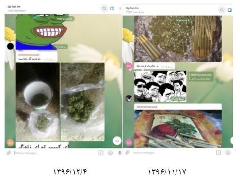 در برخی کانالها و گروههای تلگرام انواع مختلف مواد مخدر گل (ماری جوانا)، LSD، کوکائین، و ... به فروش میرسد. جالب اینجاست که برخی از این جرائم به صورت طولانی مدت و بدون هیچ مشکلی در حال انجام هستند. به عنوان مثال در تصویر زیر یکی از گروههای مروج مواد مخدر در تلگرام مشاهده میشود که طی 6 ماه انتهایی سال 1396 در این زمینه فعال بوده و طی این مدت هیچ برخوردی نیز با آن صورت نگرفته است.