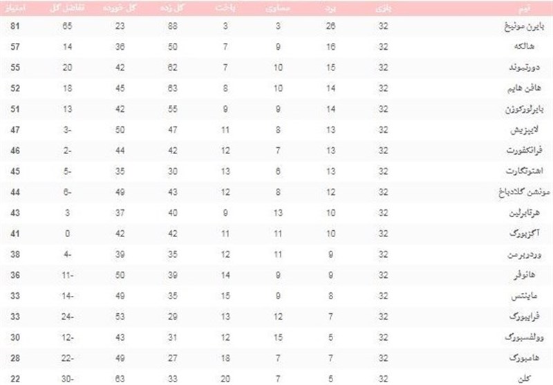 جدول رده‌بندی بوندس‌لیگا در پایان هفته سی و دوم