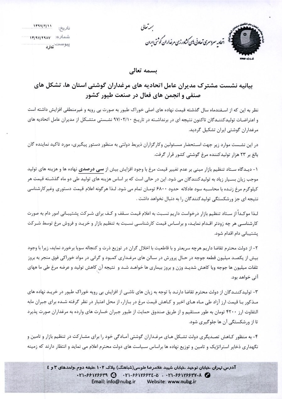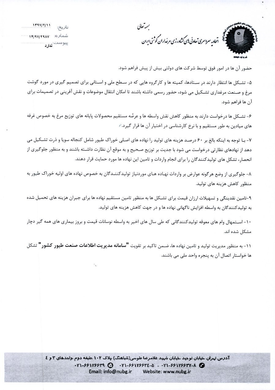 2- از دولت محترم تقاضا داریم هر چه سریعترو با قاطعیت با اختلالگران در توزیع ذرت و کنجاله سویا برخورد نماید. زیرا با وجود بیش از یکصد میلیون قطعه جوجه در حال پرورش در سالنهای مرغداری کمبود و گرانی در مواد خوراکی فوق منجر به بروز تلفات میلیونها جوجه و با کاهش شدید وزن و برو زبیماریها خواهد شد و نتیجه آن کاهش تولید و عرضه مرغ طی ماههای آتی خواهد بود.