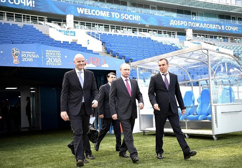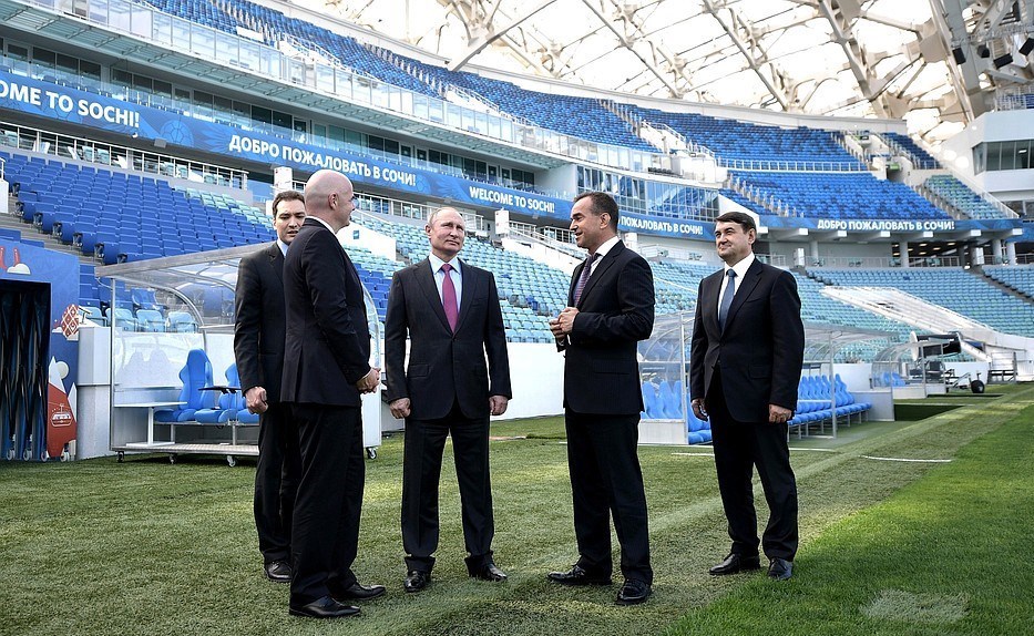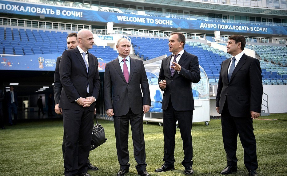 به گزارش خبرگزاری تسنیم، ولادیمیر پوتین و جانی اینفانتینو روز گذشته (پنجشنبه) در حاشیه جلسه شورای ناظران کمیته سازماندهی جام جهانی 2018 فوتبال به بازدید از ورزشگاه فیشت شهر سوچی پرداختند. رئیس‌ جمهوری روسیه و رئیس فیفا به همراه اعضای شورای نظارت کمیته سازماندهی جام جهانی 2018 فوتبال درباره آماده‌سازی این کشور برای میزبانی از رقابت‌ها، حمل‌ونقل، خدمات پزشکی و ... به بحث و تبادل نظر پرداختند.