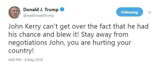 ترامپ در پیامی توئیتری نوشت که جان کری شانس خود را امتحان کرده است و آن را از بین برده است.