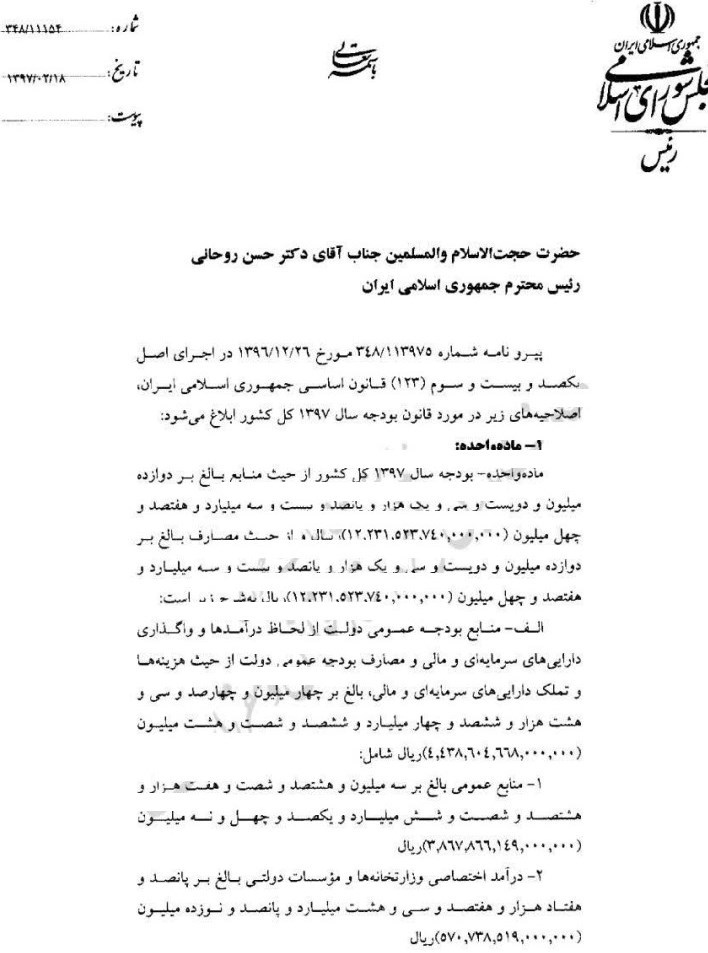 به گزارش خبرنگار اقتصادی خبرگزاری تسنیم، علی لاریجانی رئیس مجلس شورای اسلامی اصلاحیه قانون بودجه سال 97 را برای اجرا به رئیس جمهور ابلاغ کرد. بر این اساس، تغییراتی در ماده واحده ، تبصره 12 و 2ردیف بودجه در خصوص وزارت دفاع و پشتیبانی اصلاحاتی ایجاد شده است.