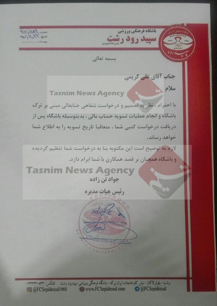 علی کریمی در گفتوگو با خبرنگار ورزشی خبرگزاری تسنیم، درباره صحبتهای جواد تنزاده مالک باشگاه سپیدرود مبنی بر اینکه کریمی امروز (دوشنبه) اصلاً به این باشگاه مراجعه نکرده است، اظهار داشت: طبق نامهای که تنزاده به من داده بود، از من درخواست کرد تا درخواست تسویه حسابم را به صورت کتبی به باشگاه اعلام کنم و من هم همین کار را انجام دادم.