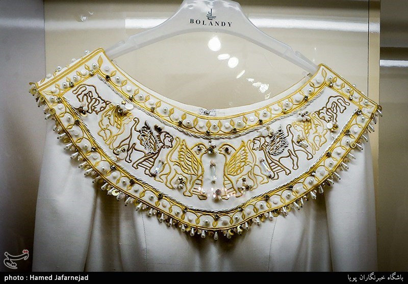 نقوش این لباس بر اساس کتیبهای مادی طراحی شده و رو آن سرمهدوزی ایرانی کار شده است.
