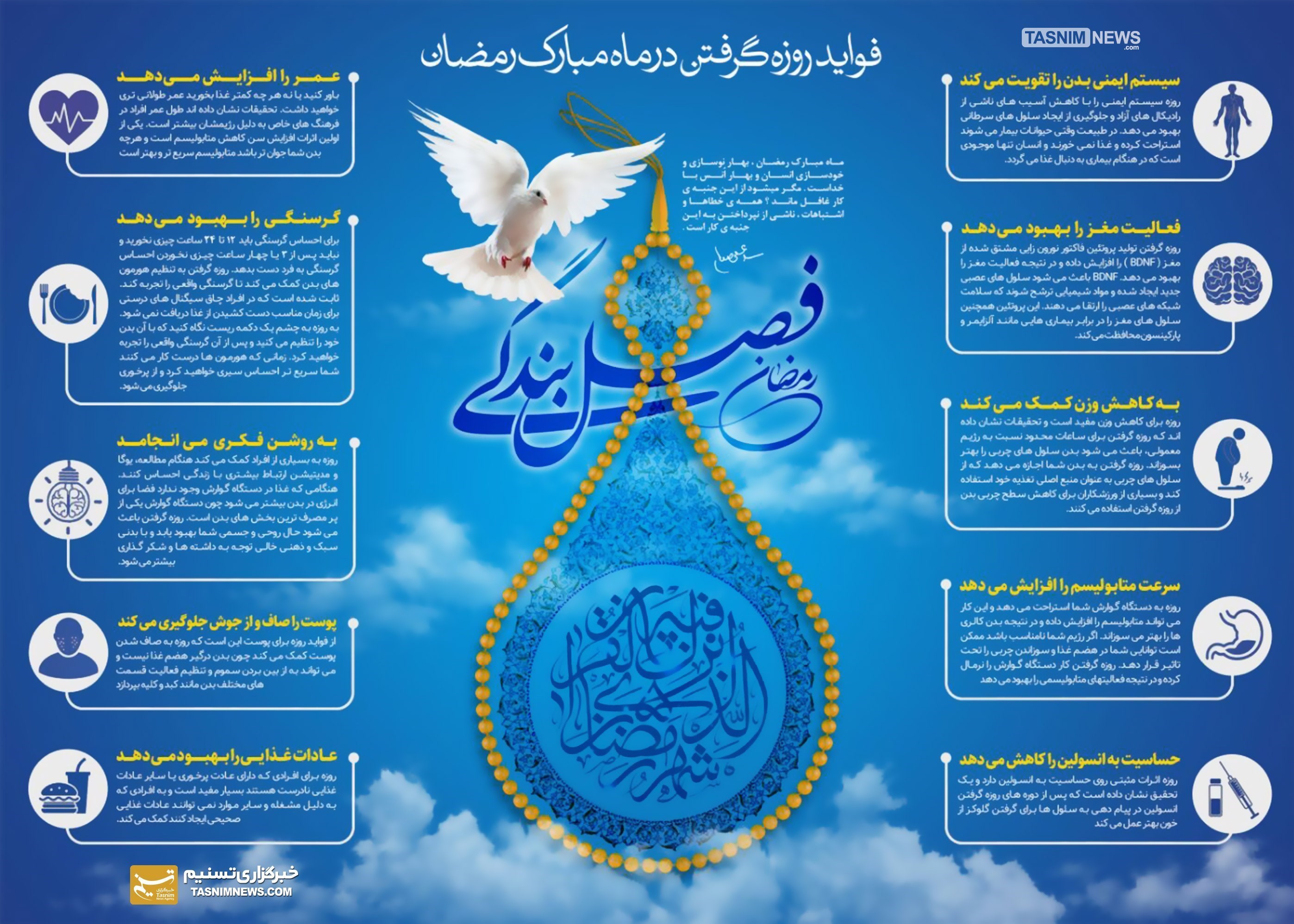 اینفوگرافیکِ "فواید روزه‌گرفتن در ماه مبارک رمضان" توسط خبرگزاری تسنیم تولید و منتشر شد.