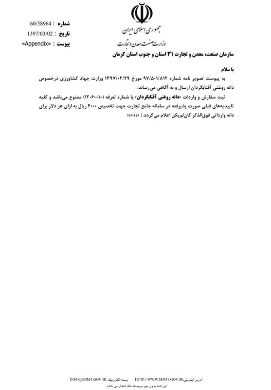 همچنین در این نامه اشاره شده است که کلیه تاییدیه های قبلی صورت پذیرفته در سامانه جامع تجارت برای تخصیص 4000 ریال به ازای هر دلار برای واردات فوقالذکرکان لم یکن اعلام میشود.