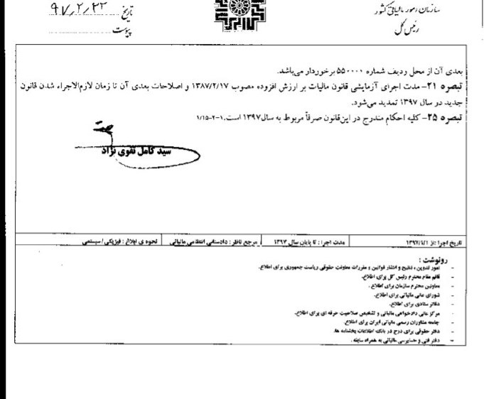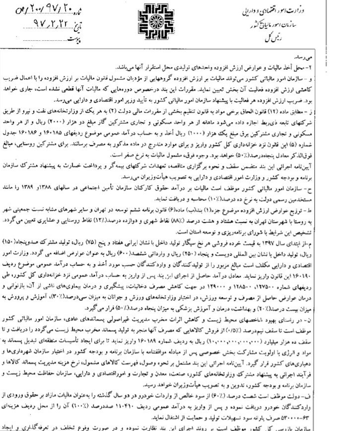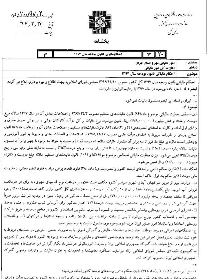 به گزارش خبرنگار اقتصادی خبرگزاری تسنیم، رئیس کل سازمان مالیاتی احکام مربوط به مالیات قانون بودجه سال 97 را برای اجرا به ادارات امور مالیاتی ابلاغ کرد.